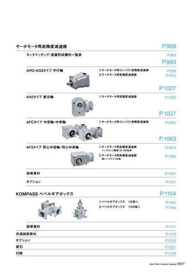 サーボモータ用高精度減速機モータマッチング・容量形状種別一覧表APG/AG3タイプ平行軸1.サーボモータ用コンパクト高精度減速機2.サーボモータ用高精度減速機AH2タイプ直交軸1.サーボモータ用高精度減速機AFCタイプ中空軸・中実軸1.サーボモータ用コンパクト高精度減速機バックラッシ精度1分・3分仕様1.サーボモータ用高精度減速機2.サーボモータ用高精度減速機低バックラッシ仕様1.ベベルギアボックス<K型>2.ベベルギアボックス<KN型>AF3タイプ同心中空軸・同心中実軸技術資料オプションKOMPASSベベルギアボックス技術資料共通技術資料オプション索引付録968969993998101210271030103710421063107010821097115111541160116411711178120512211239GearMotorGeneralCatalog/0027