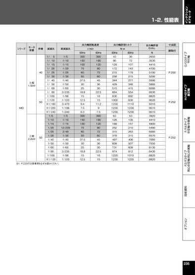 1-2.性能表インダクションギアモータオプション技術資料F2/F3タイプ同心中空軸・同心中実軸F/FAタイプ中空軸・中実軸H/H2タイプ直交軸G/G3タイプ平行軸シリーズモータ容量枠番減速比実減速比r/minN・m出力軸回転速度出力軸許容トルク出力軸許容O.H.L.三相1.5kW4050MID三相2.2kW501/51/101/151/201/251/301/401/501/601/801/1001/120※1/160※1/200※1/2401/51/101/151/201/251/301/401/501/601/801/100※1/1201/51/101/151/201/251/301/401/501/603/2351/981/1203/4701/1961/2401/51/101/1512/2352/491/301/401/501/603/2351/981/12050Hz30015010075605037.5302518.81512.59.47.56.330015010075605037.5302518.81512.560Hz36018012090726045363022.5181511.297.536018012090726045363022.5181550Hz43861281722152583444295156648301000123012301230631261892523153784876097319741220123060Hz36721071431792152773464155546928301110123012305310515721026331540650760981210101220N265035304410470051005290559058806080853088209020931095109510392044104900549060806570706075508130843088208820注1.P.233の注意事項を必ずお読みください。寸法図脚取付P.250P.252P.252235