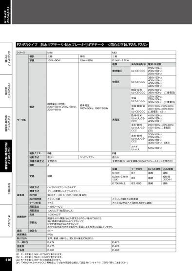 インダクションギアモータG/G3タイプ平行軸H/H2タイプ直交軸F/FAタイプ中空軸・中実軸F2/F3タイプ同心中空軸・同心中実軸技術資料オプションF2/F3タイプ防水ギアモータ・防水ブレーキ付ギアモータ<同心中空軸/F2S、F3S>シリーズ相数容量MINI三相15W~90W単相15W~90WMID三相0.1kW~2.2kW種類海外規格対応標準電圧UL・CE・CCC倍電圧UL・CE・CCC電源標準電圧(3定格)200V/50Hz、200V/60Hz、220V/60Hz標準電圧100V/50Hz、100V/60Hzモータ部異電圧韓国・台湾UL・CE・CCC中国UL・CE・CCC中国・韓国・台湾UL・CE・CCC欧州・北米UL・cUL・CE・CCC北米・欧州UL・cUL・CE・CCC北米・欧州UL・cUL・CE・CCCカナダUL・cUL電源/周波数200V/50Hz、200V/60Hz、220V/60Hz380V/50Hz、400V/50Hz、400V/60Hz、440V/60Hz220V/60Hz、380V/60Hz(二重電圧)220V/50Hz、230V/50Hz、380V/50Hz(二重電圧)220V/50Hz、220V/60Hz、380V/50Hz、380V/60Hz(二重電圧)(注1)415V/50Hz、440V/50Hz、480V/60Hz230V/60Hz、460V/60Hz、400V/50Hz二重電圧)(注2)208V/60Hz、230V/60Hz、460V/60Hz、400V/50Hz(注3)575V/60Hz耐熱クラス始動方式保護冷却方式極数B種直入れ全閉自冷4定格連続コンデンサランF種直入れ全閉外扇(0.1kW全機種と0.2kWのブレーキなしは全閉自冷)容量0.1kW0.2kW、0.4kW(注4)IE20.75kW以上IE3、GB3モータ効率IE1UL・CE規格連続CCC規格連続短時間(120分)連続連続連続減速方式潤滑方式出力軸出力軸材質ケース材質周囲温度周囲湿度高度雰囲気塗装色減速部周囲条件塗装保護構造取付方向モータ特性性能表寸法図ステンレス鋼または炭素鋼アルミ(50枠はアルミ鋳物、55枠は鋳鉄)ハイポイドギアとヘリカルギアグリース潤滑(メンテナンスフリー)新JISキー(JISB1301-1996普通形)ステンレス鋼アルミ-10℃~40℃100%以下(結露なきこと)1,000m以下腐食性ガス・爆発性ガス・蒸気などのない場所であること強い雨風が直接かかることがないこと日光が直接あたることがないこと水中や高水圧のかかる場所や、薬品による洗浄には適していませんグレーIP65水平、垂直、傾斜など、据え付け角度の制限なしP.474P.476P.481P.475P.478P.483416注1.モータ容量0.1kW~0.75kW対象となります。注2.モータ容量0.75kW~2.2kW対象となります。注3.モータ容量0.1kW~0.4kW対象となります。注4.三相0.2kW、0.4kWはCCC規格品としては短時間定格仕様として認証されていますので、ご使用の際はご注意ください。