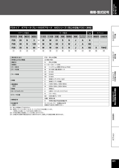 機種・型式記号インダクションギアモータオプション技術資料F2/F3タイプ同心中空軸・同心中実軸F/FAタイプ中空軸・中実軸H/H2タイプ直交軸G/G3タイプ平行軸ギアヘッド型式モータ型式ブレーキ仕様オプション取付区分枠番軸区分減速比モータ区分モータ仕様容量相数電源電圧規格ターミナルボックスブレーキ補助記号仕様記号T9HZ⑭⑬XNB22⑫BAA⑪AJJ⑩JNW⑨NSC⑧C01024⑦0MM⑥MMM⑤M51200④8NNN③F3SF3SF3S①203035②F3タイプギアモータ・ブレーキ付ギアモータMIDシリーズ<同心中空軸/F3S>[単相]①取付区分(注1)②枠番および出力軸径③軸区分④減速比⑤モータ区分⑥モータ仕様⑦モータ容量⑧相数⑨電源電圧(注3)⑩規格⑪ターミナルボックス⑫ブレーキ仕様⑬補助記号⑭仕様記号(注4):同心中空軸F3S:同心中空軸出力軸(内径)N5:1/5~12X:1/1200MM010204SCNWJANB2空欄:標準仕様Xターミナルボックス位置指示記号詳細はP.583をご参照ください。:インダクション標準(IP44orIP40):IE1効率B種標準モータ:0.1kW:0.2kW:0.4kW:単相コンデンサラン(注2):単相コンデンサ始動:100V/50Hz、100V/60Hz:200V/50Hz、200V/60Hz:規格なし:A型ターミナルボックス(アルミ):ブレーキなし:200V級ブレーキ付:特殊仕様記号追加認識記号注1.同心中実軸タイプはありません。注2.単相コンデンサラン形モータには、サーマルプロテクタを内蔵しています。ご使用上の注意についてはP.640をご参照ください。注3.その他の電圧/周波数についてはお問い合わせください。注4.仕様記号は銘板の製品型式名には表示されません。銘板上の仕様記号欄に表示されます。421