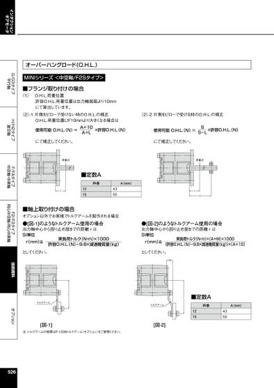 インダクションギアモータG/G3タイプ平行軸H/H2タイプ直交軸F/FAタイプ中空軸・中実軸F2/F3タイプ同心中空軸・同心中実軸技術資料オプションオーバーハングロード(O.H.L.)MINIシリーズ<中空軸/F2Sタイプ>■フランジ取り付けの場合(1)O.H.L.荷重位置許容O.H.L.荷重位置は出力軸端面より10mmにて算出しています。(2)-1片側をピローで受けない時のO.H.L.の補正O.H.L.荷重位置Lが10mmより大きくなる場合は(2)-2片側をピローで受ける時のO.H.L.の補正使用可能O.H.L.(N)=A+10A+Lにて補正してください。×許容O.H.L.(N)使用可能O.H.L.(N)=SS-L×許容O.H.L.(N)にて補正してください。荷重点■定数A枠番A(mm)L12154355荷重点LS■軸上取り付けの場合オプション以外でお客様でトルクアームを製作される場合●[図-1]のようなトルクアーム使用の場合出力軸中心から回り止め部までの距離rはSI単位実負荷トルク(N・m)×1000rmm)≧許容O.H.L.(N)-9.8×減速機質量(kg)●[図-2]のようなトルクアーム使用の場合出力軸中心から回り止め部までの距離rはSI単位r(mm)≧実負荷トルク(N・m)×(A+M)×1000{許容O.H.L.(N)-9.8×減速機質量(kg)}×(A+10)としてください。としてください。Mrトルクアーム[図-1]注.トルクアームの板厚はP.1206トルクアーム(オプション)をご参照ください。r■定数Aトルクアーム枠番A(mm)12154355[図-2]526
