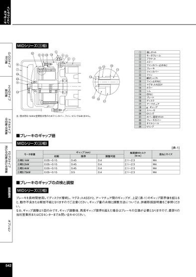 インダクションギアモータG/G3タイプ平行軸H/H2タイプ直交軸F/FAタイプ中空軸・中実軸F2/F3タイプ同心中空軸・同心中実軸技術資料オプションMIDシリーズ(三相)226212019543218723249101213181114151617注.防水形0.1kWは全閉自冷形のためファンカバー、ファン、Vリングはありません。■ブレーキのギャップ値MIDシリーズ(三相)①②③④⑤⑥⑦⑧⑨⑩⑪⑫⑬⑭⑮⑯⑰⑱⑲⑳通しボルトモータフレームブラケットステーファンカバー止めねじブレーキファンカバーファン継ぎシャフトファン止めねじマグネットASSYカラーシム皿ねじプレートディスクアーマチュアg:ギャップスペーサOリングカバー固定ボルトブレーキカバーオイルシールVリング[表-1]モータ容量三相0.1kW三相0.2kW三相0.4kW三相0.75kW初期0.05~0.150.05~0.150.05~0.150.05~0.15ギャップ(mm)限界調整可能推奨締付トルク[N・m]皿ねじサイズ0.450.450.450.50.40.40.40.42.1~2.32.1~2.32.1~2.32.1~2.3M4M4M4M4■ブレーキのギャップの点検と調整MIDシリーズ(三相)ブレーキを長時間使用してディスクが摩耗し、マグネットASSYと、アーマチュア間のギャップが、上記〈表-1〉のギャップ限界値を超えると、動作不良または解放不能となりますのでご注意ください。ギャップ量の点検と調整方法については、詳細取扱説明書をご参照ください。なお、ギャップ調整は1回のみです。ギャップ調整後、再度ギャップ限界を超えた場合はブレーキの交換が必要となりますので、最寄りの当社営業所またはCSセンターまでお問い合わせください。542