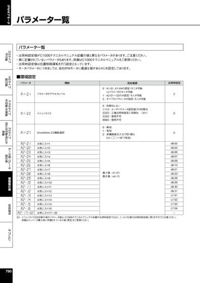 IPMギアモータG3タイプ平行軸H2タイプ直交軸F/FAタイプ中空軸・中実軸F3タイプ同心中空軸・同心中実軸モータ部・ブレーキ部仕様制御部仕様技術資料オプションパラメータ一覧パラメータ一覧・・・・出荷時設定値がC1000テクニカルマニュアル記載の値と異なるパラメータがあります。ご注意ください。表に記載されていないパラメータもあります。詳細はC1000テクニカルマニュアルをご参照ください。出荷時設定値は位置制御運転を行う設定となっています。モータパラメータにつきましては、当社IPMモータに最適な値があらかじめ設定してあります。■環境設定パラメータ機能設定範囲出荷時設定パラメータのアクセスレベルイニシャライズDriveWorksEZ機能選択お気に入り1お気に入り2お気に入り3お気に入り4お気に入り5お気に入り6お気に入り7お気に入り8お気に入り9お気に入り10お気に入り11お気に入り12お気に入り13お気に入り14お気に入り15お気に入り16お気に入り17~32~0:A1-01、A1-04の設定/モニタ可能Uパラメータのモニタ可能1:A2-01~32のみ設定/モニタ可能2:すべてのパラメータが設定/モニタ可能0:初期化しない1110:ユーザパラメータ設定値での初期化2220:工場出荷時設定に初期化(注1)3330:使用不可6660:使用不可0:無効1:有効2:多機能接点入力で切り替え(H1-□□=9Fで有効)最小値:A1-01最大値:o4-13200d9.02d9.05d9.06d9.07d9.08d9.10d9.21d9.22d9.28d9.29d9.30d9.31L7.01L7.02L7.03L7.04̶注1.イニシャライズ2220実行後のパラメータ値は、C1000テクニカルマニュアル記載の出荷時設定ではなく、ニッセイ仕様の出荷時設定値に戻りますのでご注意ください。詳細はインバータ購入時に同梱されている小紙(黄色)をご参照ください。790