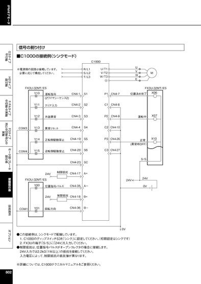 IPMギアモータG3タイプ平行軸H2タイプ直交軸F/FAタイプ中空軸・中実軸F3タイプ同心中空軸・同心中実軸モータ部・ブレーキ部仕様制御部仕様技術資料オプションFX3U-32MT/ESY10運転指令(2ワイヤシーケンス2)CN4-1S1P1CN4-7位置決め完了X06FX3U-32MT/ESY11クリア入力CN4-2S2C1CN4-8Y12外部異常CN4-3S3P2CN4-9運転中X07COM3Y13異常リセットCN4-4S4C2CN4-10Y14正転側駆動禁止CN4-19S5P3CN4-26X10正常(異常時OFF)COM4Y15逆転側駆動禁止CN4-20S6C3CN4-27MUVWEC1000R/L1S/L2T/L3U/T1V/T2W/T3信号の割り付け■C1000の接続例(シンクモード)※電源側の回路は省略しています。必要に応じて構成してください。CN4-23SC24V制限抵抗CN4-17A+FX3U-32MT/ESY00位置指令パルスCN4-35A-24V制限抵抗CN4-18B+COM1Y01回転方向CN4-36B-S/S24V0V24V●この接続例は、シンクモードで配線しています。1.C1000のディップスイッチS3を「シンク」に設定してください。(初期設定はシンクです)2.FX3Uの端子「S/S」に「24V」を入力してください。●制限抵抗は、位置指令パルスがオープンコレクタの場合に接続します。24V入力では2.2kΩ(1W以上)の抵抗を接続してください。入力電圧によって、制限抵抗の抵抗値が異なります。0V※詳細については、C1000テクニカルマニュアルをご参照ください。802