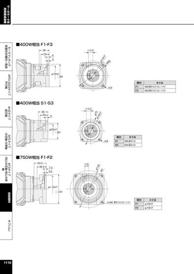 サーボモータ用高精度減速機モータマッチング・容量形状種別一覧表APG/AG3タイプ平行軸AH2タイプ直交軸AFCタイプ中空軸・中実軸AF3タイプ同心中空軸・同心中実軸技術資料オプション4-B種別F1F3B寸法M6深さ12カンツウ)M5深さ12カンツウ)(13.5)φ14H709φφ70H7□80853629■400W相当F1・F3■750W相当F1・F250.538.57.55.5(16)541φφAφ110H7□1204-B種別S1S3B寸法M5深さ12M4深さ124-M8深さ14(カンツウ)種別A寸法F1F2φ16H7φ19H711167H41φ70φ■400W相当S1・S336298φ50H7□60(13.5)
