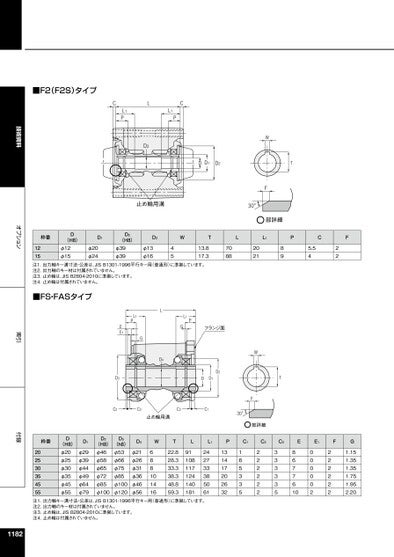 技術資料オプション索引付録■F2(F2S)タイプCL1PCL1PLD3DD1D2止め輪用溝WFT30°部詳細枠番D(H8)1215φ12φ15D1φ20φ24D2(H8)φ39φ39D3WTLL1PCFφ13φ164513.817.370882021895.5422注1.出力軸キー溝寸法・公差は、JISB1301-1996平行キー用(普通形)に準拠しています。注2.出力軸のキー材は付属されていません。注3.止め輪は、JISB2804-2010に準拠しています。注4.止め輪は付属されていません。■FS・FASタイプL1PGフランジ面WLD4L1PG1EED3D2DD1TC2C3C3C1止め輪用溝F30°部詳細枠番202530354555D(H8)φ20φ25φ30φ35φ45φ55D1φ29φ39φ44φ49φ64φ79D2(H8)φ46φ58φ65φ72φ85φ100D3(h8)φ53φ66φ75φ85φ100φ120D4φ21φ26φ31φ36φ46φ56WT68810141622.828.333.338.348.859.3L91108117124140181L1PC1C2C3EE1F2427333850611314172026321653352222223333358677610000002222222G1.151.351.351.751.952.20注1.出力軸キー溝寸法・公差は、JISB1301-1996平行キー用(普通形)に準拠しています。注2.出力軸のキー材は付属されていません。注3.止め輪は、JISB2804-2010に準拠しています。注4.止め輪は付属されていません。1182
